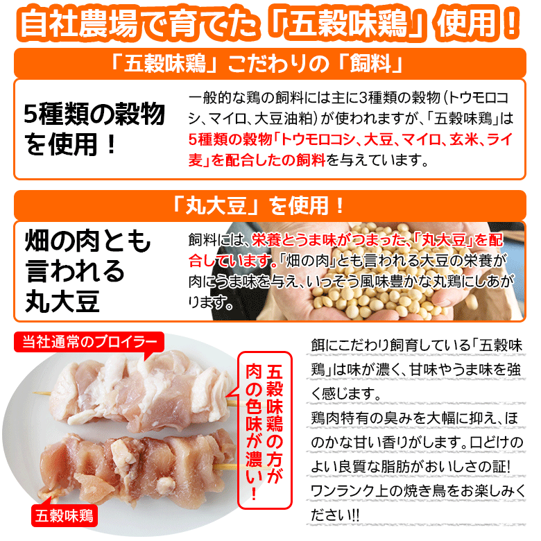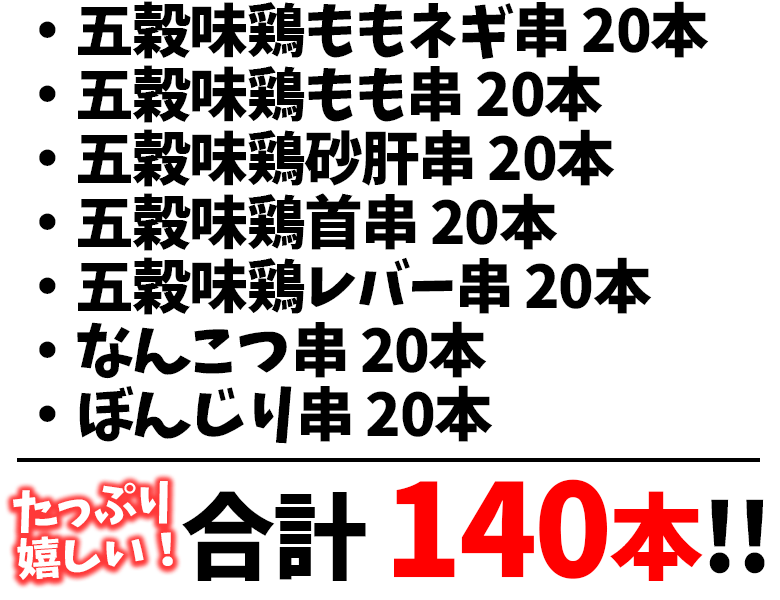 商品説明 国産品 冷凍食肉 商品名 ・五穀味鶏ももネギ串 20本 ・五穀味鶏もも串 20本 ・五穀味鶏首皮串 20本 ・五穀味鶏砂肝串 20本 ・五穀味鶏レバー串 20本 ・なんこつ串 20本 ・ぼんじり串 20本 原材料名 上記リンク先へ表記 内容量 合計140本 保存方法 -15℃以下で保存してください。