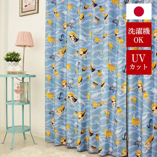 子供部屋カーテン 「マーメイド」 人魚姫 子ども キッズルーム 形状記憶加工 ブルー 女の子カーテン 物語 おとぎ話 かわいい 人魚 イエロー