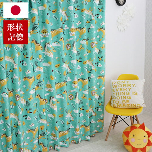 子供部屋カーテン 「ユニコーン」 馬 子ども キッズルーム 形状記憶加工 グリーン 物語 ポニー 外国風 イエロー オシャレ ファンタジー