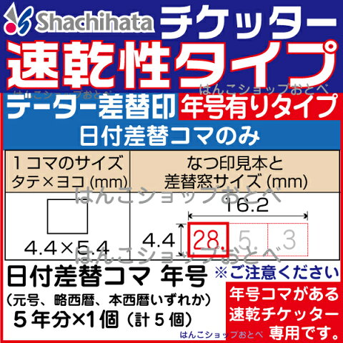 日付差替コマ 年号のみ シャチハタ チケッター速乾専用 (チケッター速乾20号・年号があるタイプ専用) (コマサイズ・一コマ4.4×5.4ミリ) 特徴 シャチハタ・チケッター速乾・日付差替印・20号型(年号があるタイプ)専用の 日付差替コマ・年号のみです。