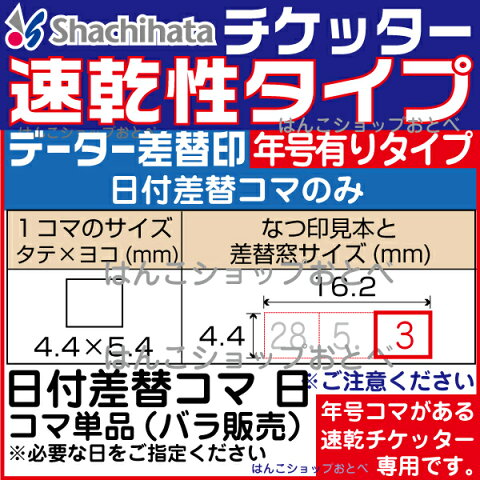 日付差替コマ 日のみ シャチハタ チケッター速乾専用 (チケッター速乾20号・年号があるタイプ専用) (コマサイズ・一コマ4.4×5.4ミリ) 特徴 シャチハタ・チケッター速乾・日付差替印・20号型(年号があるタイプ)専用の 日付差替コマ・日のみです。